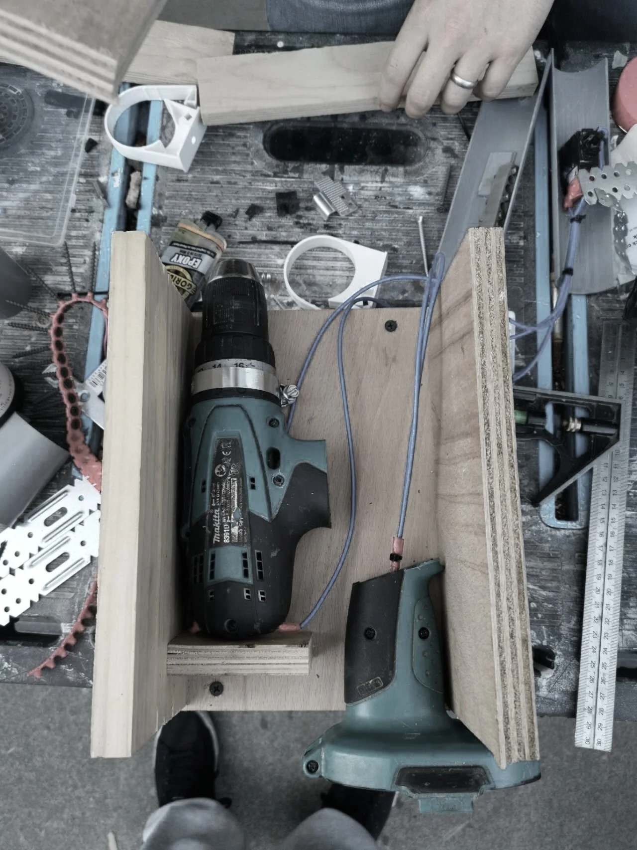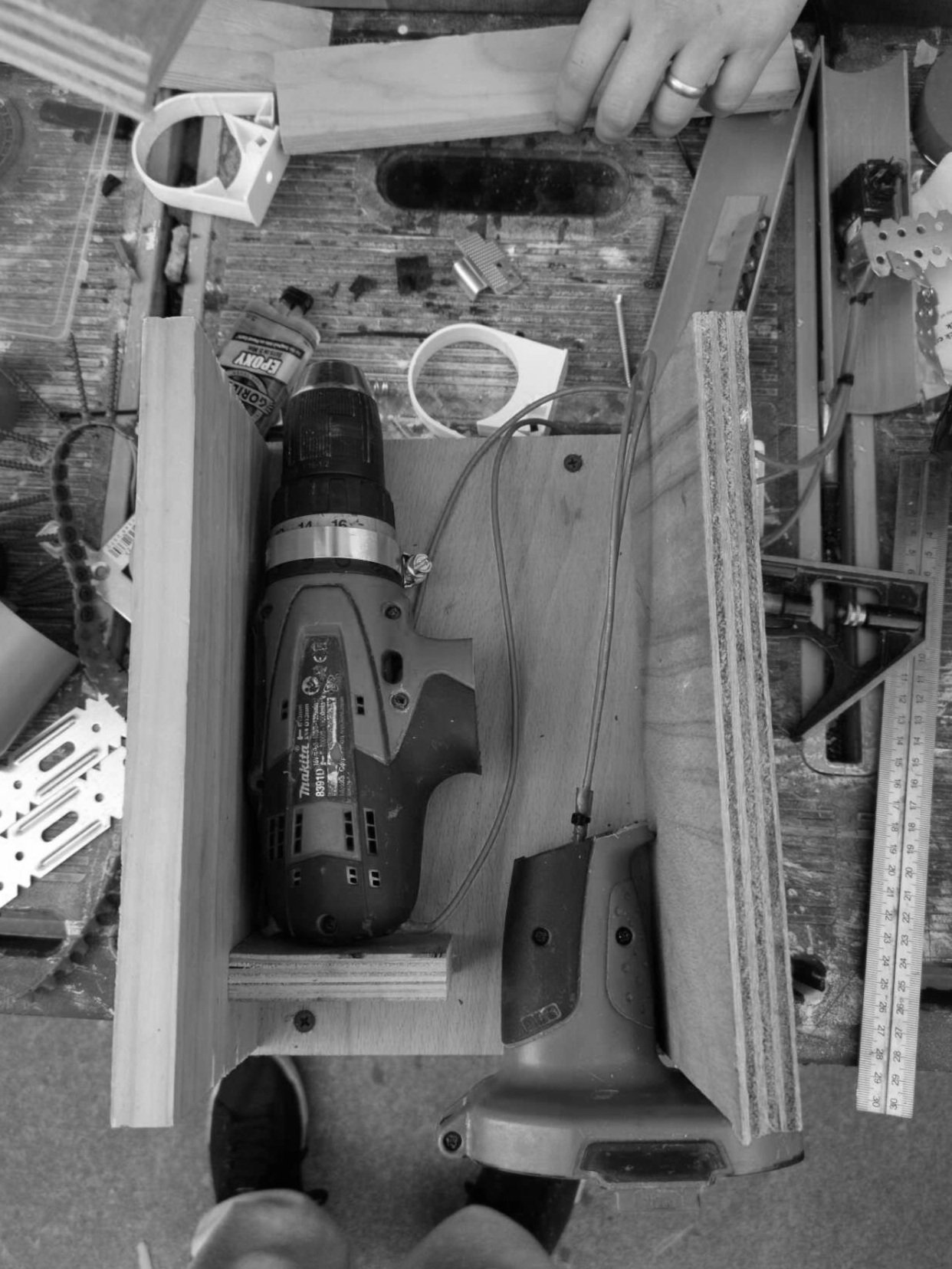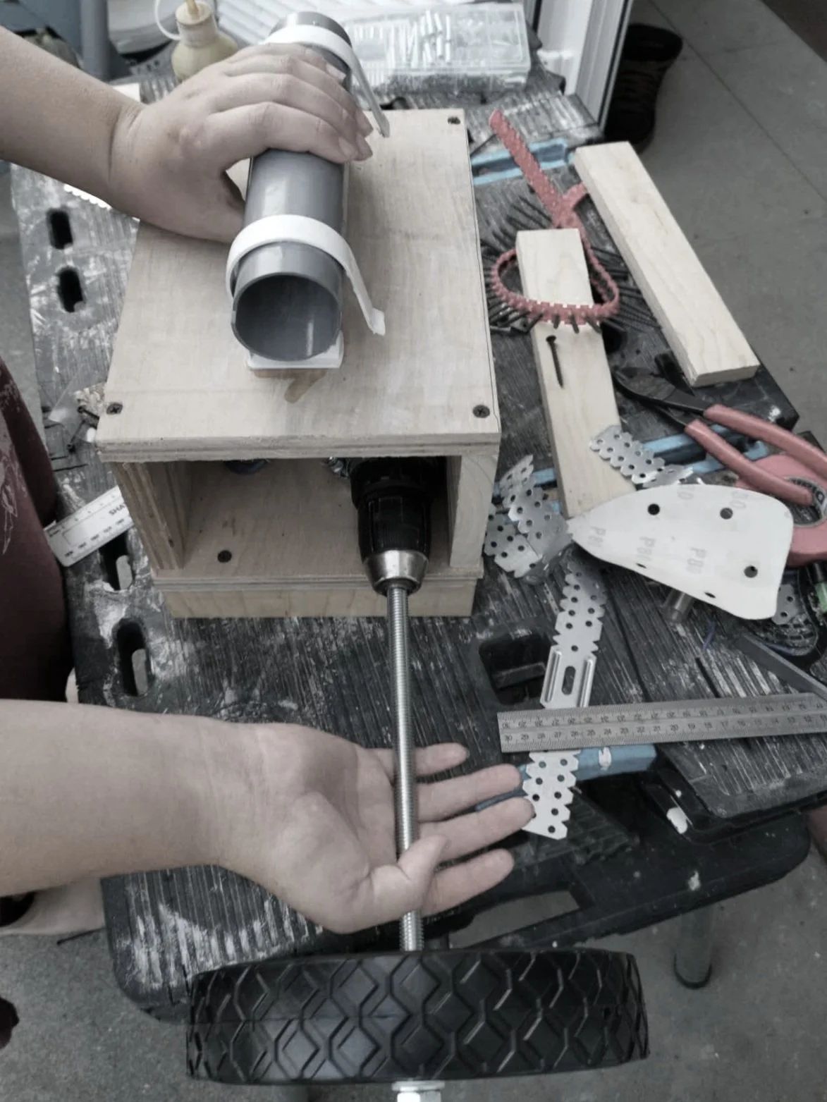 Due to limited funding at the time of construction, rather than sourcing stepper motors, building a new circuit board, and using more dedicated components, I decided to take apart a drill. The aim of this prototype was to test whether a variable-speed motor would work using the built-in Push Assist. This simple mechanism, integrated into a drill, was exactly what I needed.
